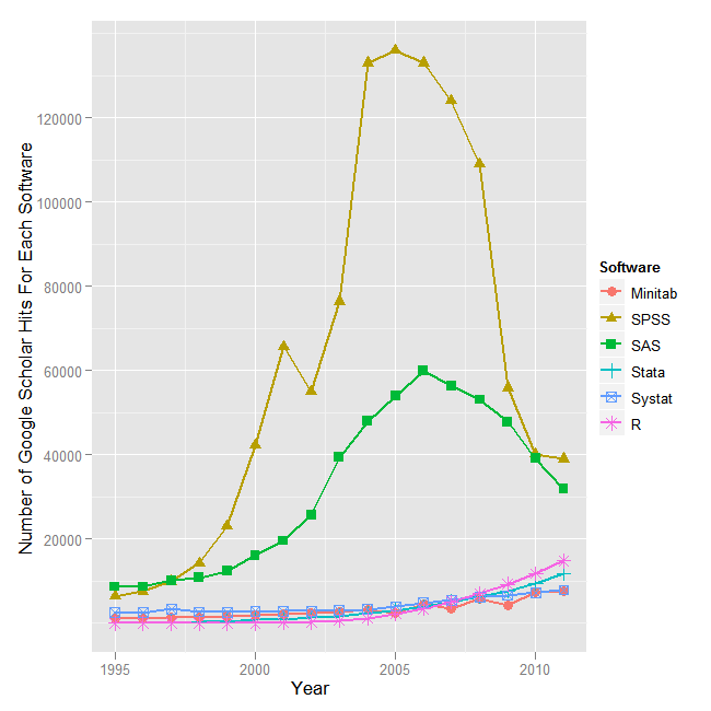 Previous ImageNext Image Fig_7a_ScholarlyImpactBig6 Figure 7a. Use of data analysis software in academic publications as measured by hits on Google Scholar. Like this:Like Loading... Like this:Like Loading...