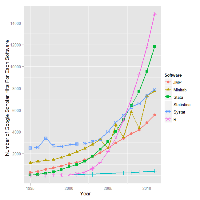 Previous ImageNext Image Fig_7b_ScholarlyImpactLittle6 Figure 7a. Use of data analysis software in academic publications as measured by hits on Google Scholar. Like this:Like Loading... Like this:Like Loading...