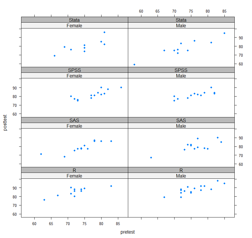 To see how different graphs look, below are three, one from each of R’s main graphics systems. This one uses traditional graphics from “Graphs> Scatterplot”: