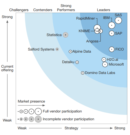 Software dropped includes: Infocentricity (acquired by FICO), SAP KXEN (tiny usage), Tableau, and Tibco. The latter two didn’t fit in with the others due to their limited selection of advanced analytic methods.