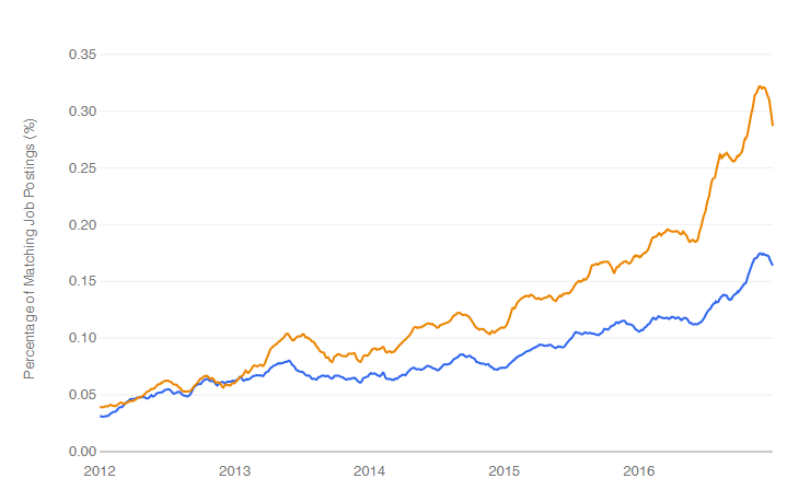 Since SAS and SPSS dominate the vertical space in Figure 2d by such a wide margin, I removed those two curves, leaving only two points of SAS usage in 2015 and 2016. The result is shown in Figure 2e.