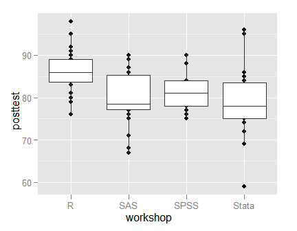 ggplot(mydata100, aes(workshop, posttest )) + geom_point() + geom_boxplot()