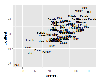 ggplot(mydata100, aes(pretest, posttest, label = as.character(gender) )) + geom_text(size = 3)