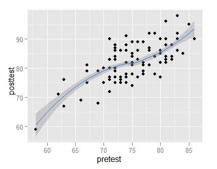 ggplot(mydata100, aes(pretest, posttest) ) + geom_point() + geom_smooth()