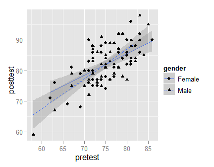 ggplot(mydata100, aes(pretest, posttest) ) + geom_smooth( aes(linetype = gender), method = "lm") + geom_point( aes(shape = gender) )